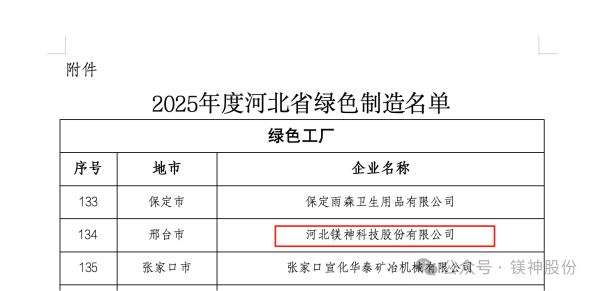 2025年9月8日,河北省工業和信息化廳正式公布了2025年河北省綠色制造名單。河北鎂神科技股份有限公司(以下簡稱“鎂神科技”)憑借在綠色制造、節能降耗、清潔生產等方面的突出表現,成功入選“2025年度河北省綠色制造名單”!這是公司積極踐行綠色發展理念、扎實推進綠色體系建設取得的重大成果,也是對鎂神科技綠色制造水平和可持續發展能力的認可!